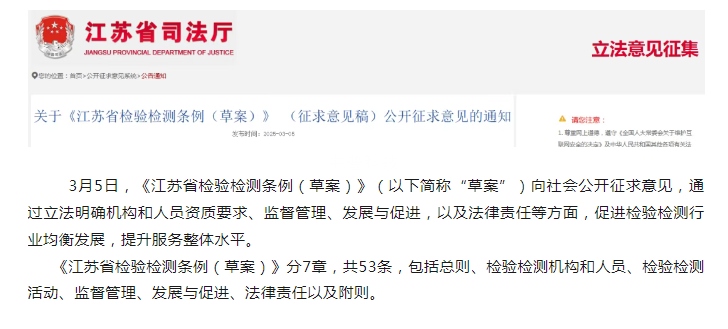 3月5日,《江苏省检验检测条例(草案)》正式向社会公开征求意见。这部共7章53条的法规草案,针对当前检验检测行业存在的低价竞争、资质挂靠、数据造假等乱象,从机构资质、监督管理、法律责任等多个维度作出系统规范,为行业健康发展提供法治保障。一、明确监管范围 实现全领域覆盖草案创新性地将检验检测机构分为两类实施监管:行政许可类:包括建设工程质量、公路水运工程、农产品质量安全、雷电防护装置等五大重点领域备案监管类:涵盖消防设施维护保养检测等需日常监督的机构这种分类监管模式既确保重点领域严格管控,又实现行业监管无死角,为全国检验检测行业立法提供了"江苏样本"。二、剑指行业顽疾 出台硬核措施针对当前突出的行业乱象,草案祭出组合拳:严禁低价竞争:首次以立法形式明确禁止不合理低价服务,从源头遏制"劣币驱逐良币"强化过程管控:要求原始记录和报告存档不少于6年,确保检测活动可追溯压实平台责任:网络交易平台需审核机构资质并公示信息,构建线上线下一体化监管体系三、创新监管机制 提升治理效能草案单设"监督管理"专章,推出三大创新举措:信用监管:建立分级分类监管制度,根据信用评价动态调整检查频次联合惩戒:对出具虚假报告等严重违法行为,最高处以10万元罚款并吊销资质闭环管理:形成"资质许可-过程监督-违法惩处"的全链条监管闭环四、重典治乱 违法成本显著提高法律责任章节凸显"最严处罚"导向:对超范围出具报告行为,设3-5万元罚款并没收违法所得对出具虚假报告的"零容忍":机构罚5-10万元,责任人罚1-5万元建立"资格罚"制度,对情节严重者直接吊销资质许可证五、促进行业高质量发展在严格监管的同时,草案专设"发展与促进"章节,通过:推动检验检测技术研发和标准创新鼓励机构专业化、规模化发展支持检验检测服务业集聚区建设这一立法将有效解决当前检验检测市场"小散乱"问题,推动行业从价格竞争转向质量竞争。《江苏省检验检测条例》的制定,标志着检验检测行业监管进入法治化新阶段。通过建立"严准入、强过程、重处罚"的监管体系,必将有力遏制行业乱象,为经济社会高质量发展提供更可靠的检验检测服务保障。社会各界可积极参与征求意见,共同完善这一重要立法。